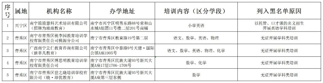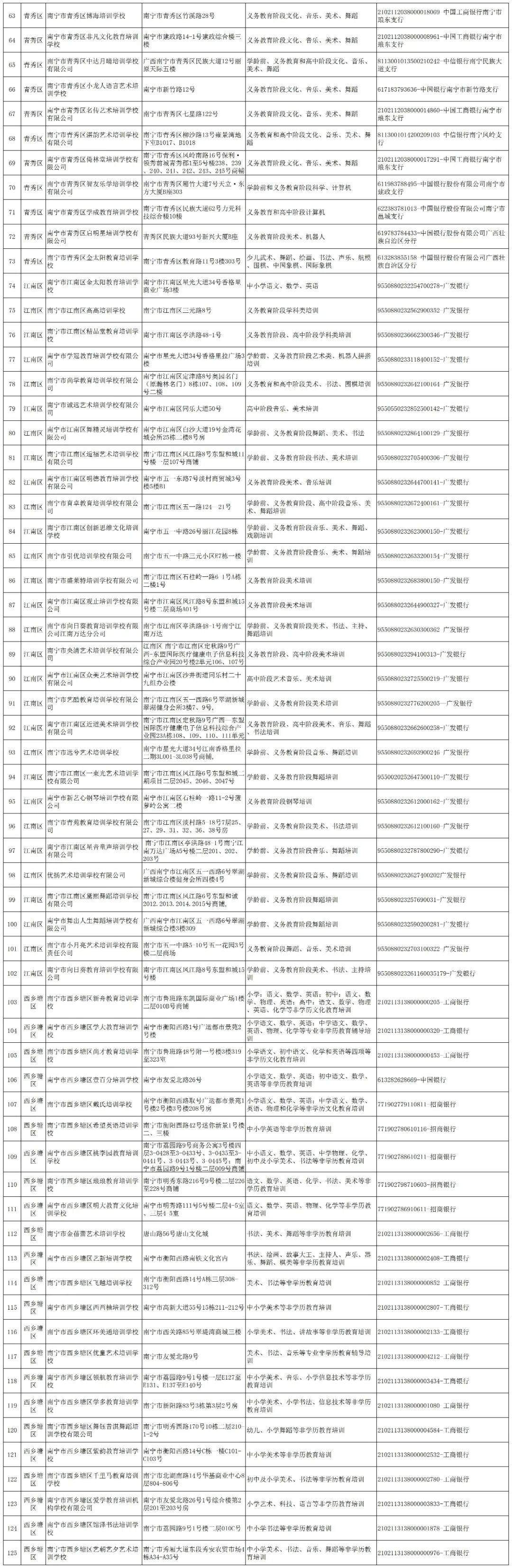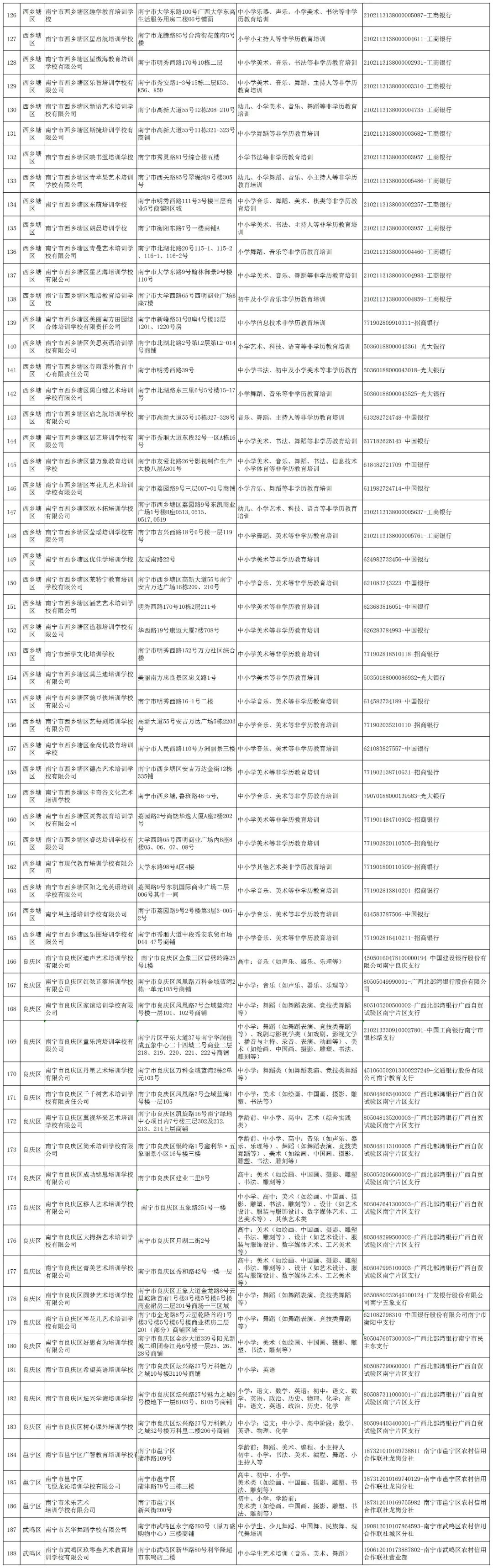 为贯彻落实中共中央办公厅、国务院办公厅《关于进一步减轻义务教育阶段学生作业负担和校外培训负担的意见》(中办发〔2021〕40号)精神,进一步规范校外培训机构办学行为,现公布南宁市各县(市、区)、开发区2023年第二批面向中小学生的校外培训机构黑白名单。黑白名单实行动态管理,供社会各界共同监督。请各单位通过官网、微信公众号、QQ等多种方式加强宣传,用好黑白名单,引导广大家长树立正确教育观念,理性看待参加校外培训的作用,如确有需要,应选择资质齐全、管理规范的培训机构,缴纳培训费用时主动核对机构提供的账户,确保培训费用存入监管账户中。