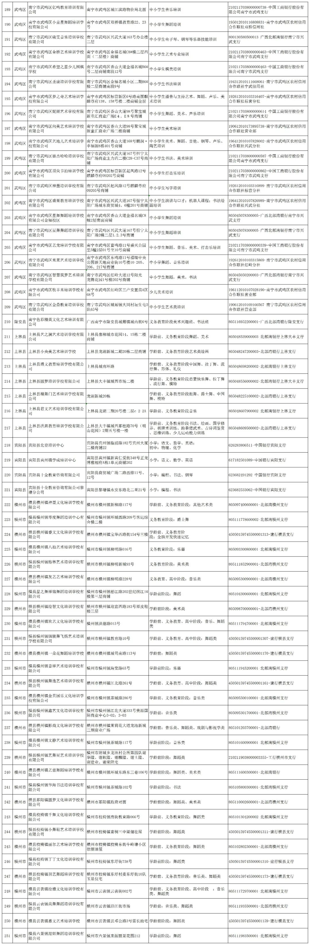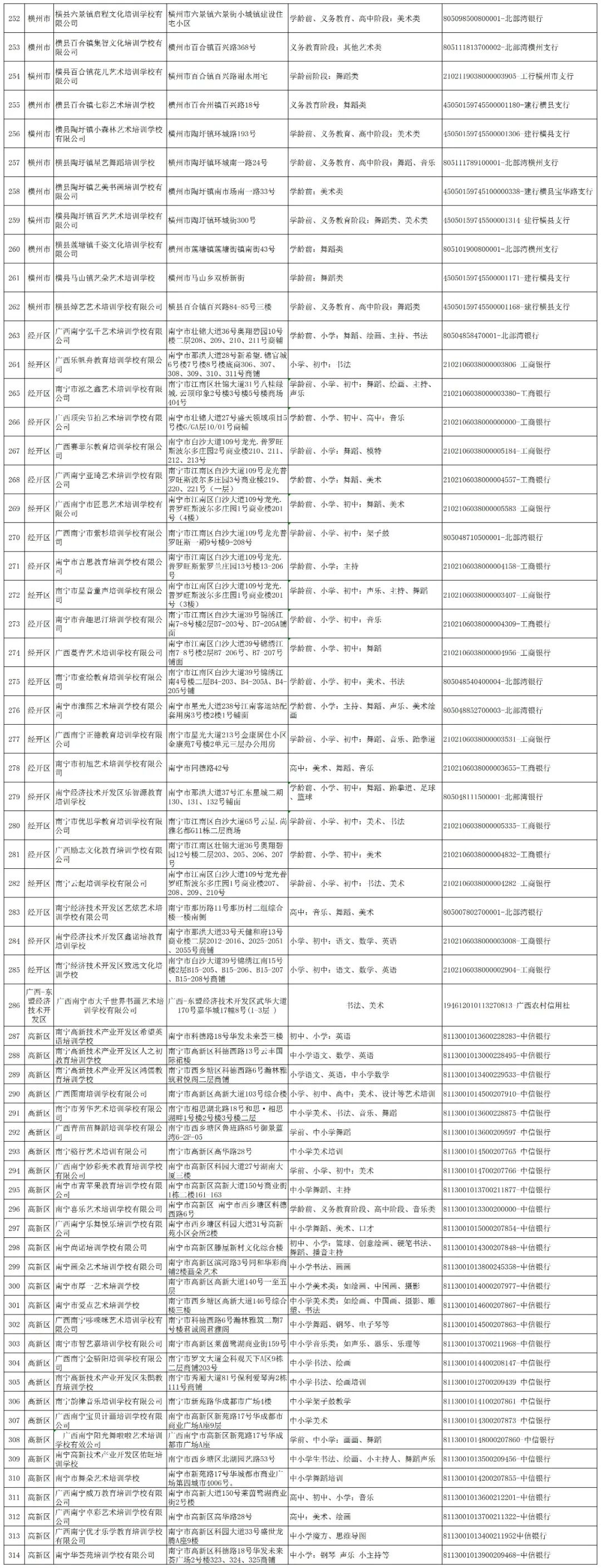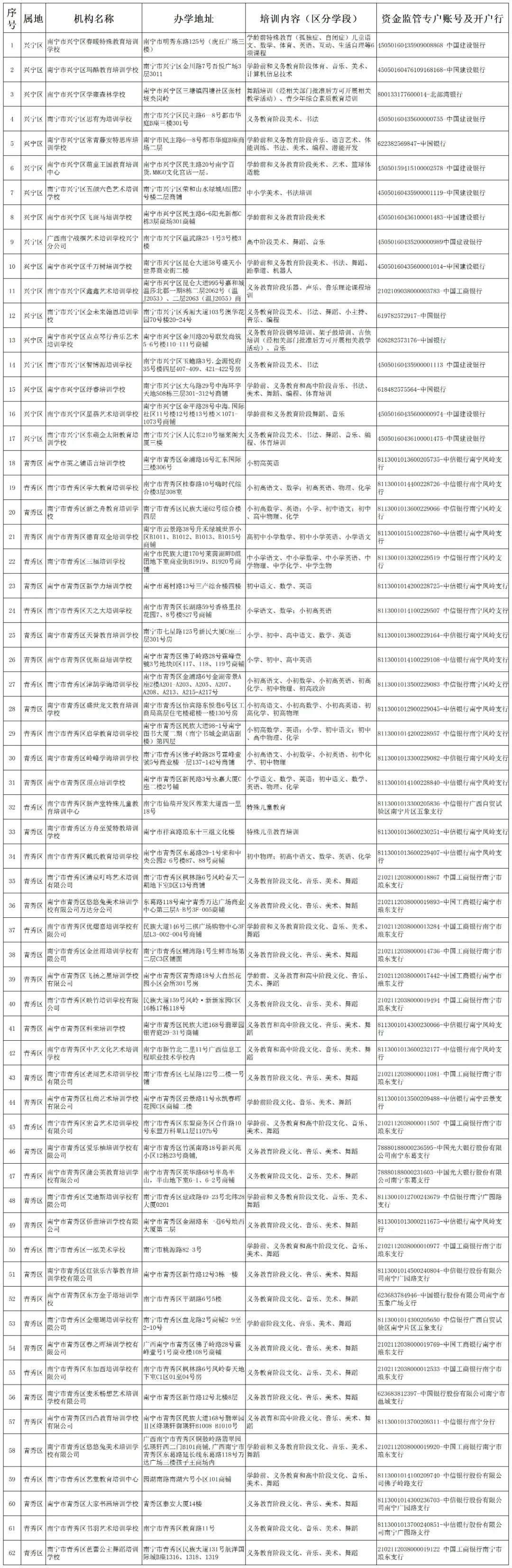 为贯彻落实中共中央办公厅、国务院办公厅《关于进一步减轻义务教育阶段学生作业负担和校外培训负担的意见》(中办发〔2021〕40号)精神,进一步规范校外培训机构办学行为,现公布南宁市各县(市、区)、开发区2023年第二批面向中小学生的校外培训机构黑白名单。黑白名单实行动态管理,供社会各界共同监督。请各单位通过官网、微信公众号、QQ等多种方式加强宣传,用好黑白名单,引导广大家长树立正确教育观念,理性看待参加校外培训的作用,如确有需要,应选择资质齐全、管理规范的培训机构,缴纳培训费用时主动核对机构提供的账户,确保培训费用存入监管账户中。